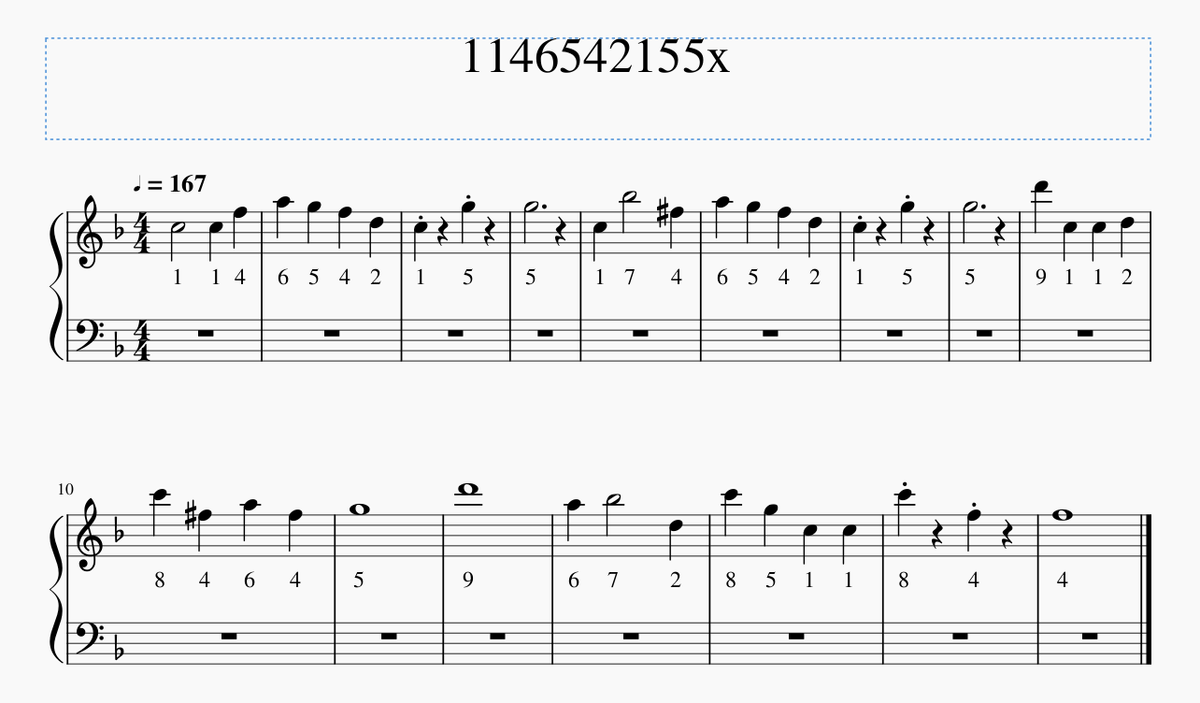 ちなみにこの曲の場合は、最初に素数表を眺めながら、1146542155Xが目に入ってこれがよさそうだな、と思いました。ペアの1746542155Xと合わせても音楽として完結しなさそうだったので、続きのメロディとして使えそうな素数を探してこういう形になりました。